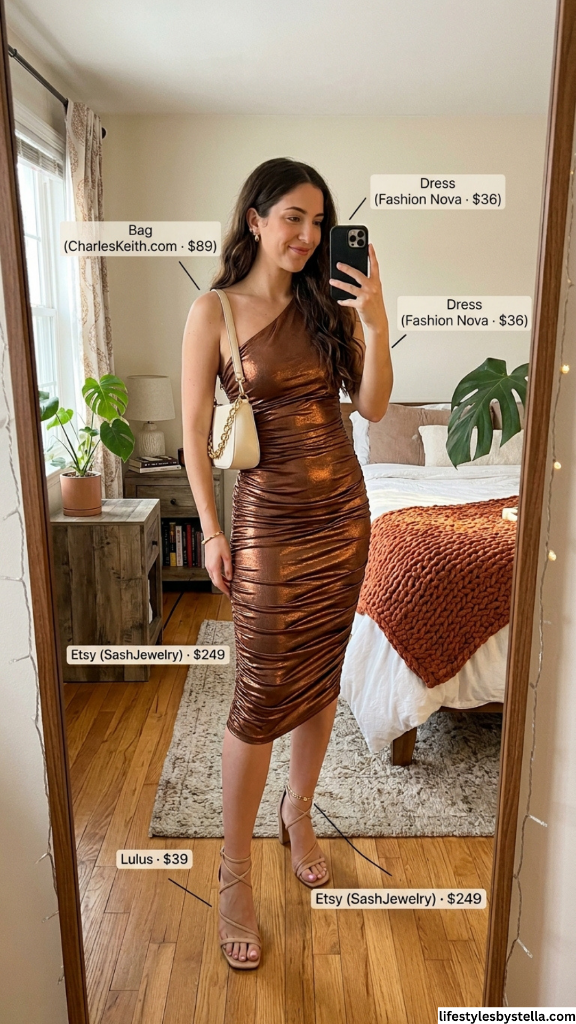 Bronze metallic in summer is one of those choices that sounds risky until you see it, and then it makes perfect sense. This one-shoulder ruched dress from Fashion Nova catches light like liquid metal — every fold and gather creates a new reflection, and the result is absolutely hypnotic. The bodycon silhouette hugs in all the right places, while the ruching is strategically placed to create texture and dimension. It’s the kind of dress that makes you stand differently, walk differently, feel differently.