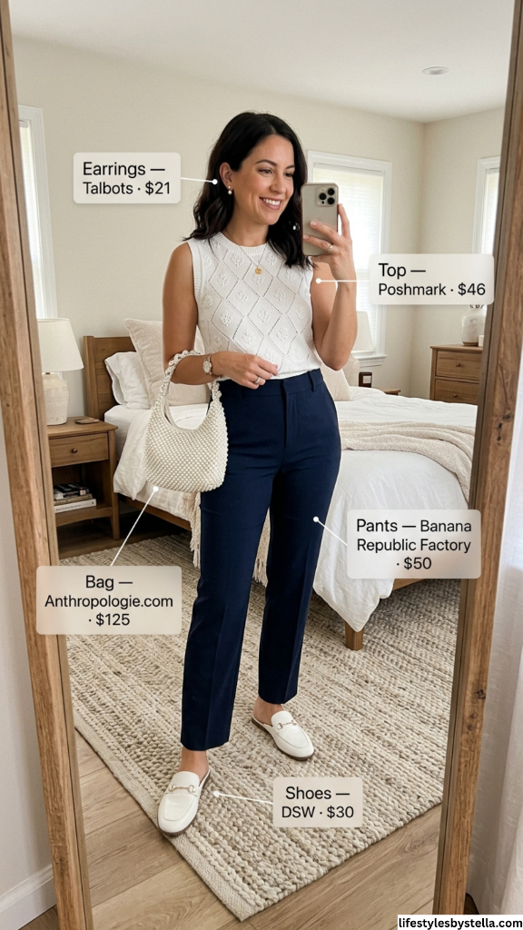 Not every going-out outfit needs to involve a mini dress or stilettos — sometimes the chicest look is the one that quietly commands the room with impeccable basics. This white pointelle knit top from Poshmark paired with navy tailored pants from Banana Republic Factory is a masterclass in smart-casual summer dressing. The texture of the knit adds visual interest without being loud, and the sleeveless cut keeps things cool and clean. Navy trousers are the workhorse of any warm-weather wardrobe — they read polished in every context.