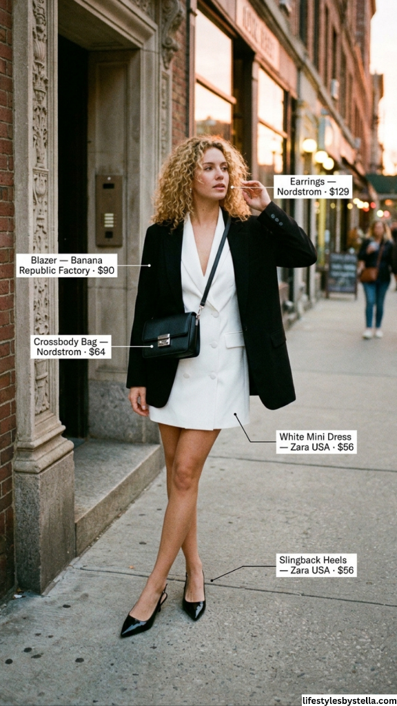 There is power in a blazer dress. Full stop. This white double-breasted mini from Zara USA has that sharp, architectural quality that makes you look like you just walked out of a fashion editorial — or a boardroom where you closed a major deal and then headed straight to dinner. The oversized black blazer draped over the shoulders adds that fashion-editor finishing touch that takes the look from “cute dress” to “I know things about style that you don’t.”