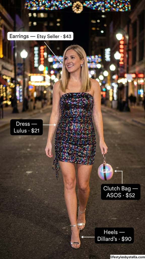 The iridescent sphere clutch from ASOS is the most fun bag on this list — it catches and refracts light just like the dress, creating a cohesive disco-ball effect. Silver strappy heels from Dillard’s are the right call because they don’t compete with the rainbow of the sequins; they complement them. And those crystal stud earrings from Etsy keep the jewelry minimal, which is exactly right. When your dress is this much of a moment, less is more everywhere else.
