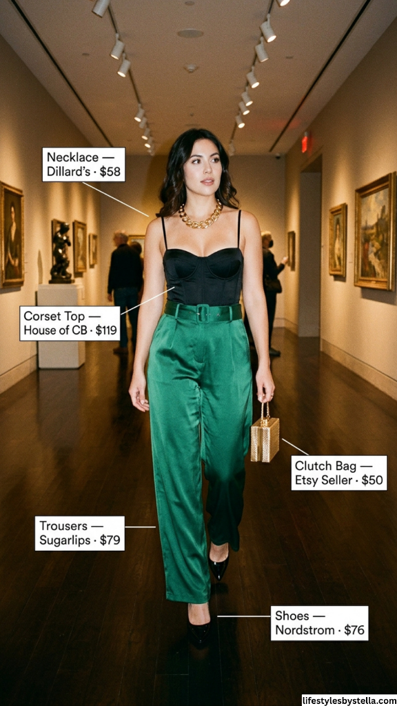 This is the outfit that made me want to write this entire article. A black corset top from House of CB paired with emerald green satin trousers from Sugarlips creates one of the most striking color combinations in fashion — there’s a reason it shows up on red carpets year after year. The corset silhouette sculpts without being restrictive (especially House of CB, which is known for engineering pieces that actually fit real bodies), and those high-waisted satin trousers have a liquid quality that catches every overhead light in a gallery or restaurant.