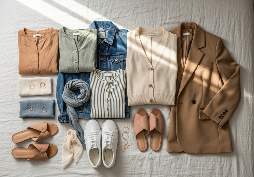The key to making this work is that everything coordinates. I keep my spring wardrobe essentials in a neutral-to-earth-tone palette — cream, tan, olive, soft blue, white — so nothing clashes and I can grab pieces almost at random. It sounds boring in theory. In practice, it’s the most freeing thing I’ve done for my closet.