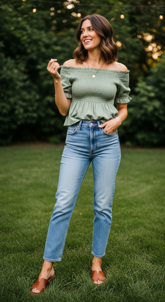Suggested alt text: how to style smocked tops with dark wash straight leg jeans and tan leather mules
