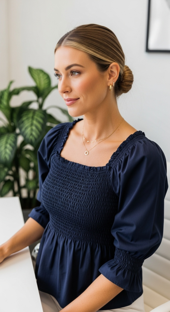 The key to how to style smocked tops for work is choosing versions that read polished rather than overly beachy or overly romantic. A smocked blouse in cotton poplin, sateen, or a more structured woven fabric is much easier to dress up than a gauzy vacation-style top.