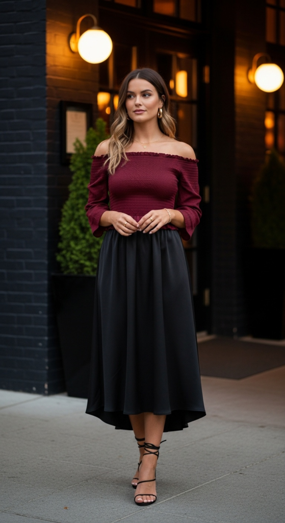 Suggested alt text: how to style smocked tops for date night with a burgundy top and black satin midi skirt