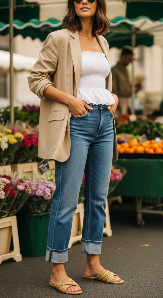 Suggested alt text: how to style smocked tops with a linen blazer and cuffed jeans for a chic casual weekend look