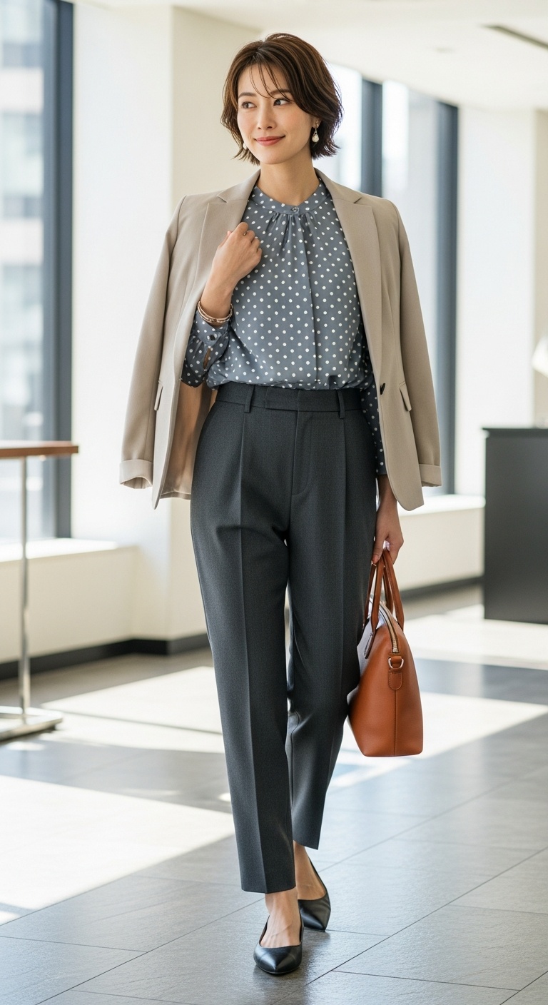 A dusty blue or olive polka dot blouse tucked into high-waisted trousers looks polished, smart, and a little more interesting than a plain shell top. Add a structured blazer if needed, and keep the shoes clean and classic.