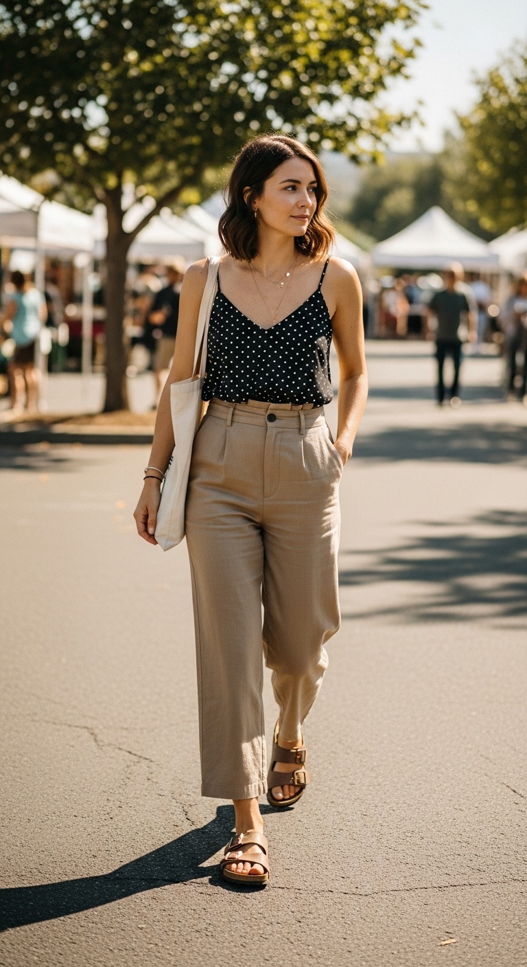 That’s why a polka dot cami with tan linen pants and Birkenstocks looks chic instead of precious. It’s not trying too hard. It feels like a real woman getting dressed for a real day.