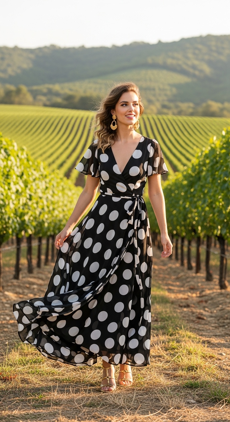 A polka dot maxi dress in chiffon, georgette, or another airy fabric feels elegant when the neckline is flattering and the silhouette has movement. Wrap shapes, V-necks, soft flutter sleeves, and a defined waist all help the print feel sophisticated instead of juvenile.