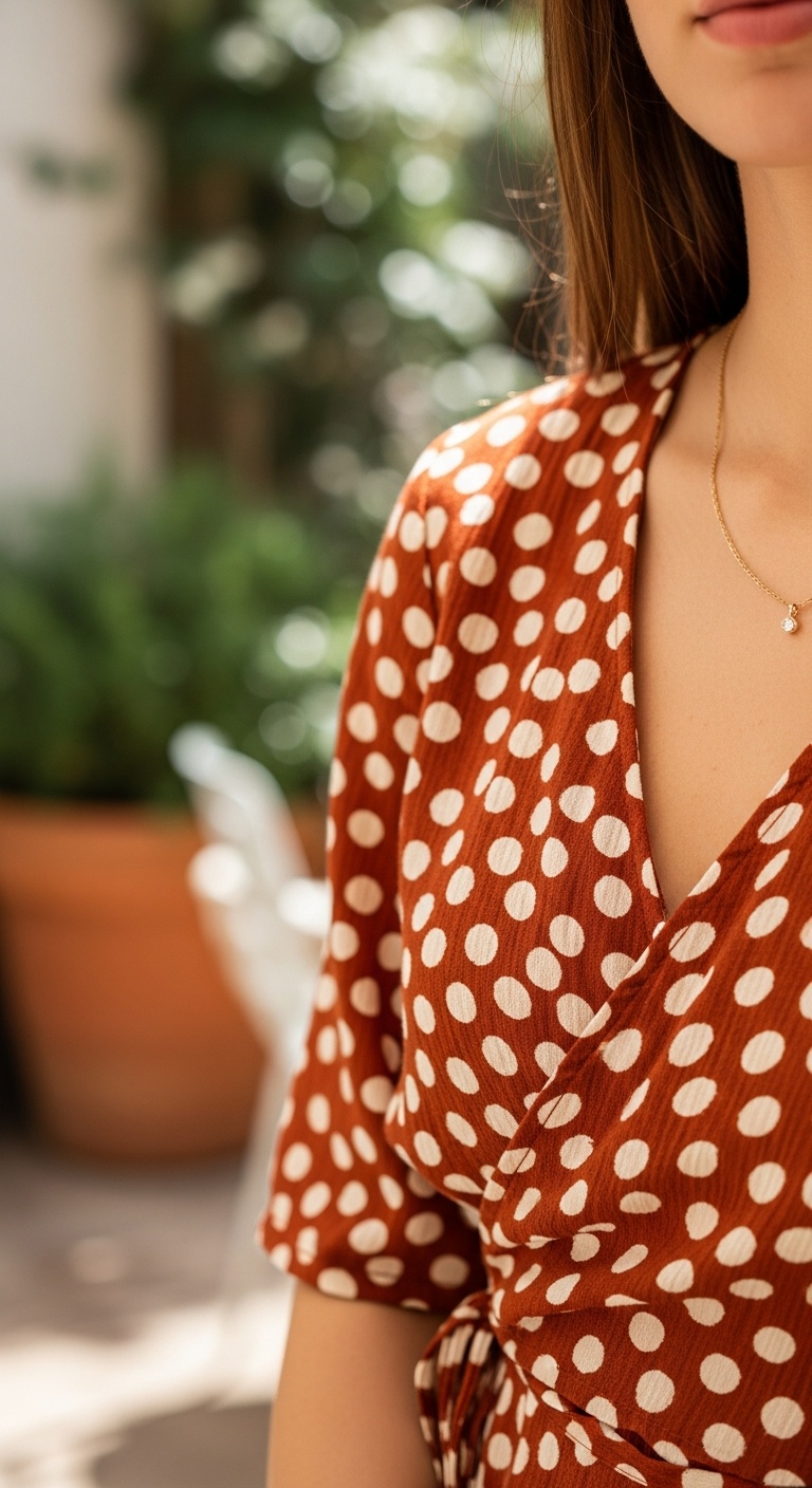 Alt text suggestion: How to wear polka dots in rust and cream with a wrap top and gold jewelry