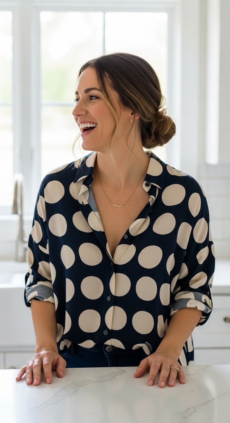 Alt text suggestion: How to wear polka dots with a navy and cream oversized blouse in a bright kitchen