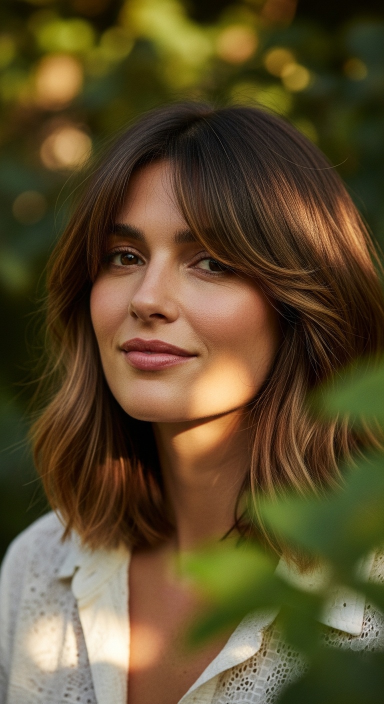 Low-maintenance layered haircuts for summer 2026 with a long layered lob in chestnut brown and soft morning-routine movement