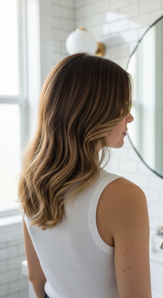 Alt text suggestion: Low-maintenance summer haircuts collarbone-length haircut with soft long layers and natural wave in a bright modern bathroom.