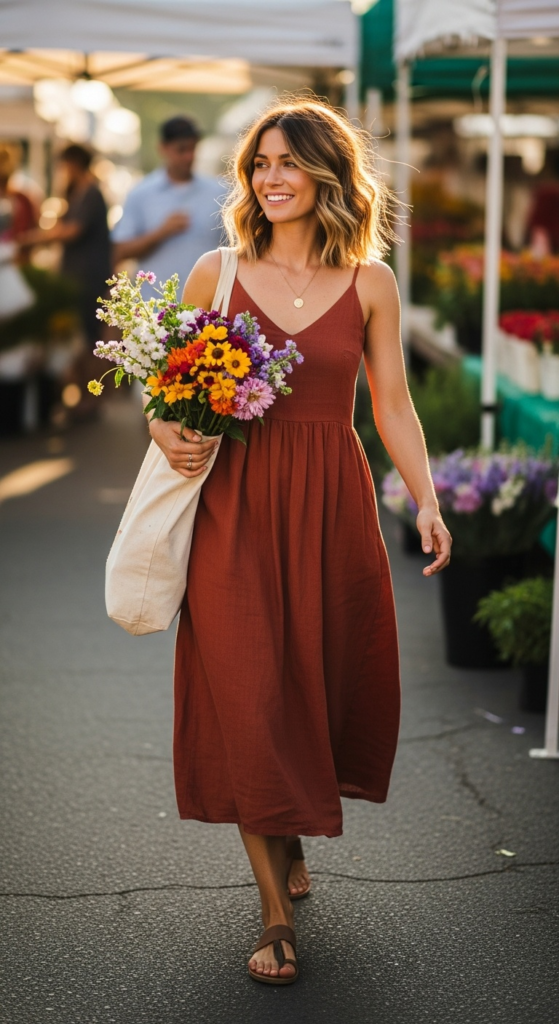 Alt text suggestion: Low-maintenance summer haircuts soft wolf cut with crown volume and wispy ends on a woman walking through a farmers market at golden hour.