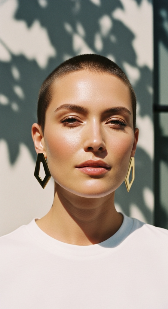 Alt text suggestion: Low-maintenance summer haircuts buzz crop on a woman with bold geometric earrings standing in bright summer light against a neutral wall.