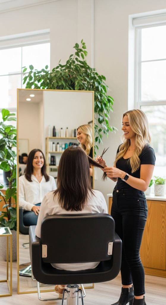 Alt text suggestion: Low-maintenance summer haircuts salon consultation with a woman and stylist talking in front of a mirror in a bright modern salon.