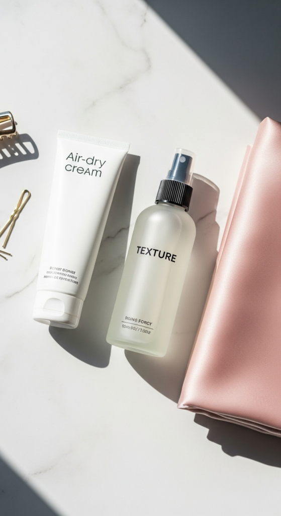 Alt text suggestion: Low-maintenance summer haircuts haircare flat lay with air-dry cream, texture spray, silk pillowcase, bobby pins, and claw clip on white marble.