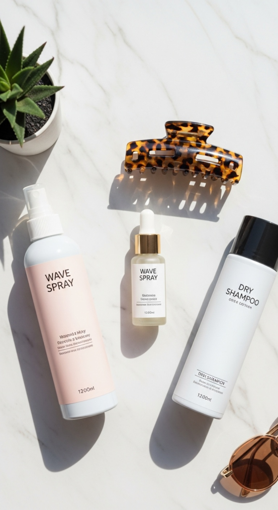 Alt text: low-maintenance summer haircuts essentials with wave spray serum claw clip and dry shampoo