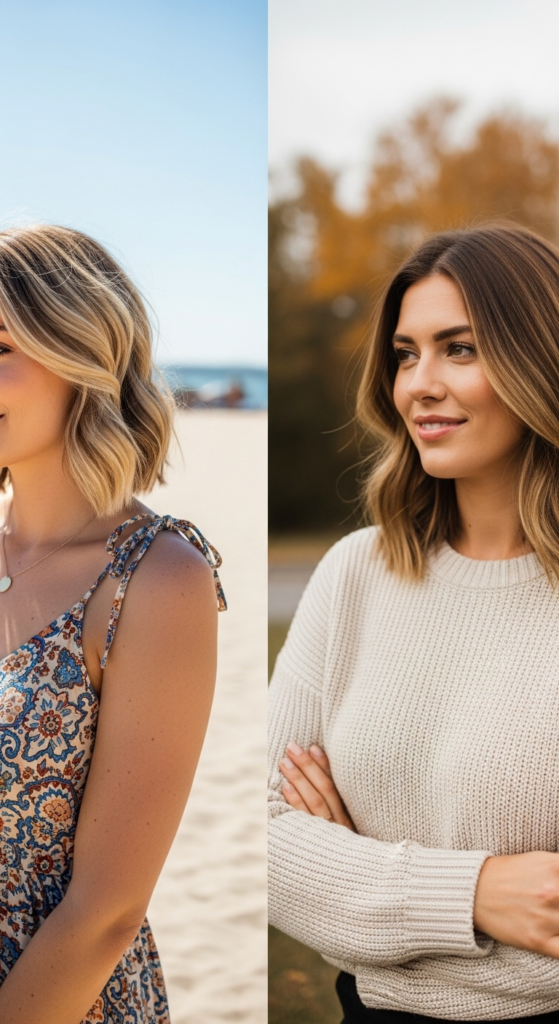 Alt text: low-maintenance summer haircuts grow-out comparison from summer collarbone cut to polished fall length