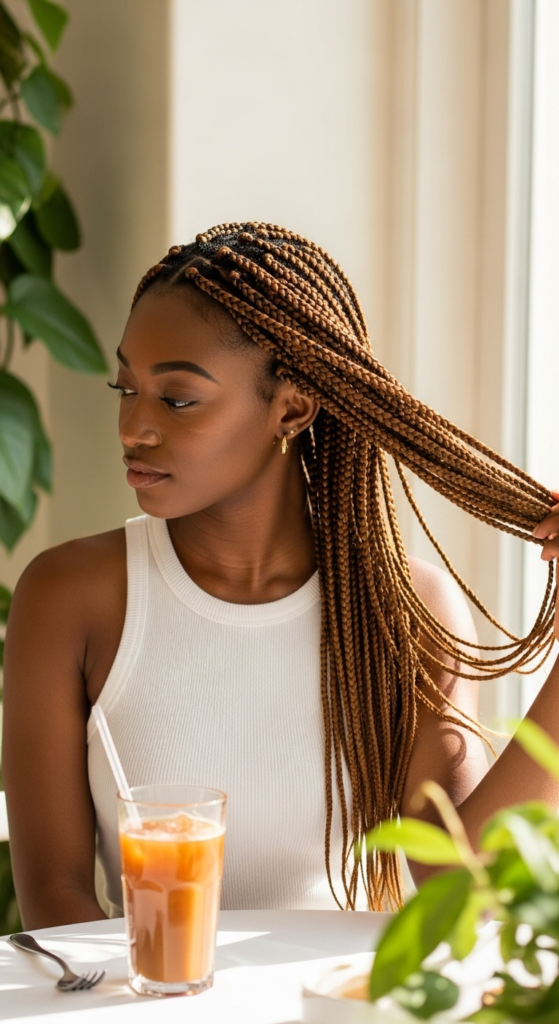 What I’d personally book tomorrow is a warm caramel brown set of medium knotless braids with a soft, flexible base and no pulling along the perimeter. If your scalp hurts on day one, they are too tight. I don’t care how pretty they look in the mirror. We are done pretending pain is part of the process.
