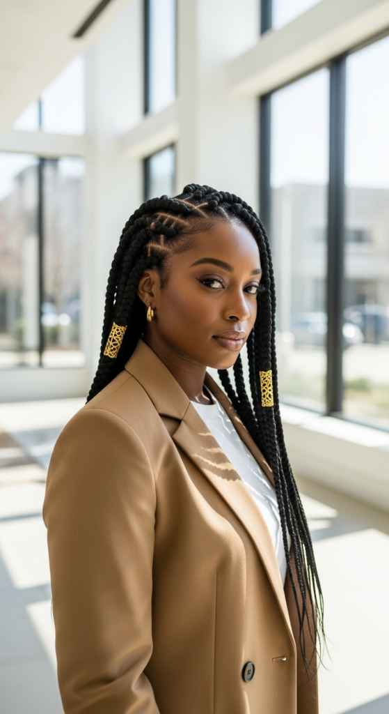 I especially love jumbo knotless braids in a sleek half-up, half-down look with a blazer, gold cuffs, or a silk scarf detail. They look polished without looking overworked. For more braid inspiration in that same easy-but-put-together lane, you can also link this section to spring braided hairstyles 2026: neutral, cute, easy braid ideas.
