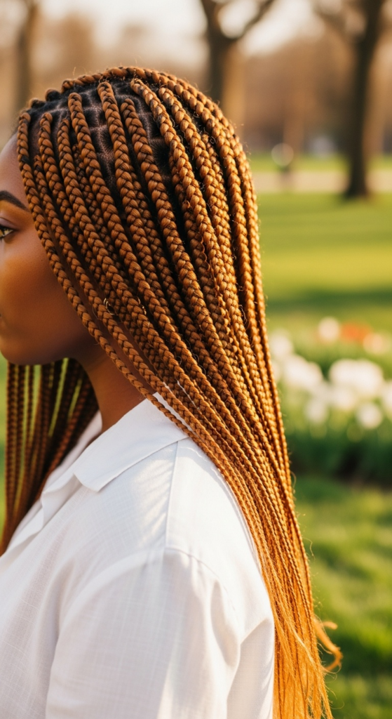 Alt text suggestion: Low tension braids in muted copper knotless braids glowing in spring golden hour light