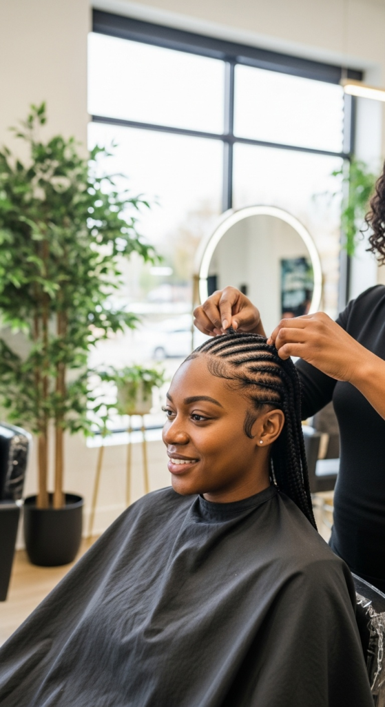 A simple sentence is enough. “Could you go softer at the front?” works. “This one feels a little snug, can we redo it?” works. “I need low tension braids because I’m protecting my edges” definitely works.