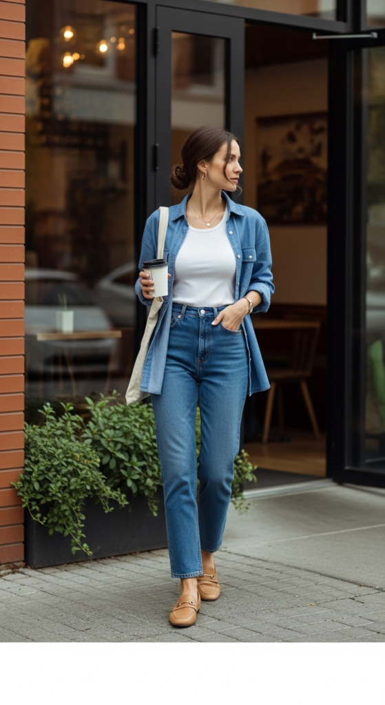 A fitted ribbed tank, an open cotton button-down or lightweight overshirt, straight-leg jeans, and loafers solve one of the most annoying parts of May dressing: temperature swings. At 8 a.m., the extra layer makes sense. At 2 p.m., you can tie it around your waist, toss it into your tote, or leave it open without the outfit collapsing.