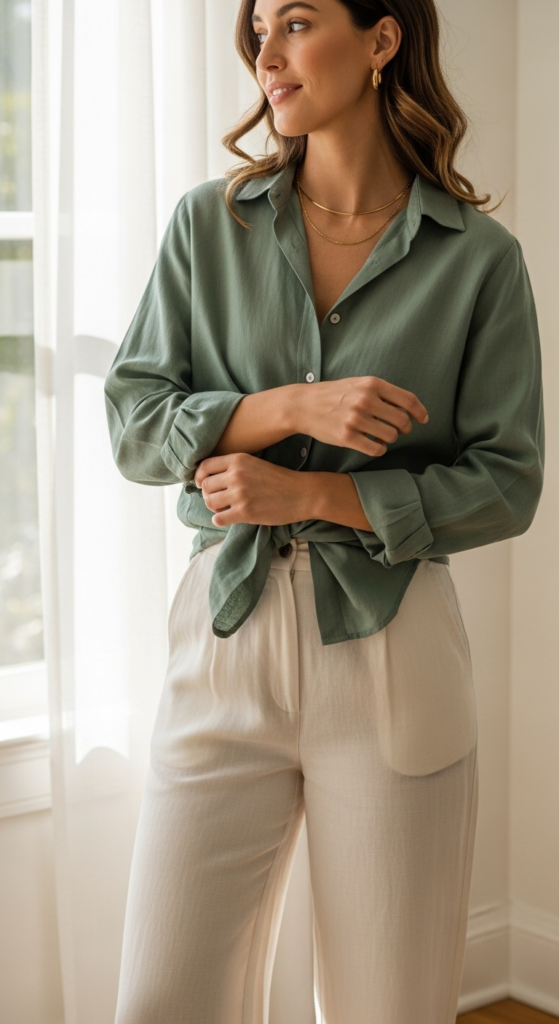 Alt text suggestion: May outfit ideas for women showing a sage-green linen shirt loosely tucked into cream wide-leg linen trousers in soft natural window light.