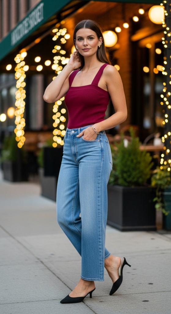A cherry-red knit shell with light-wash wide-leg denim and black kitten-heel mules feels sharper than a basic tee and distressed jeans ever could. The look is still approachable, but it reads intentional.
