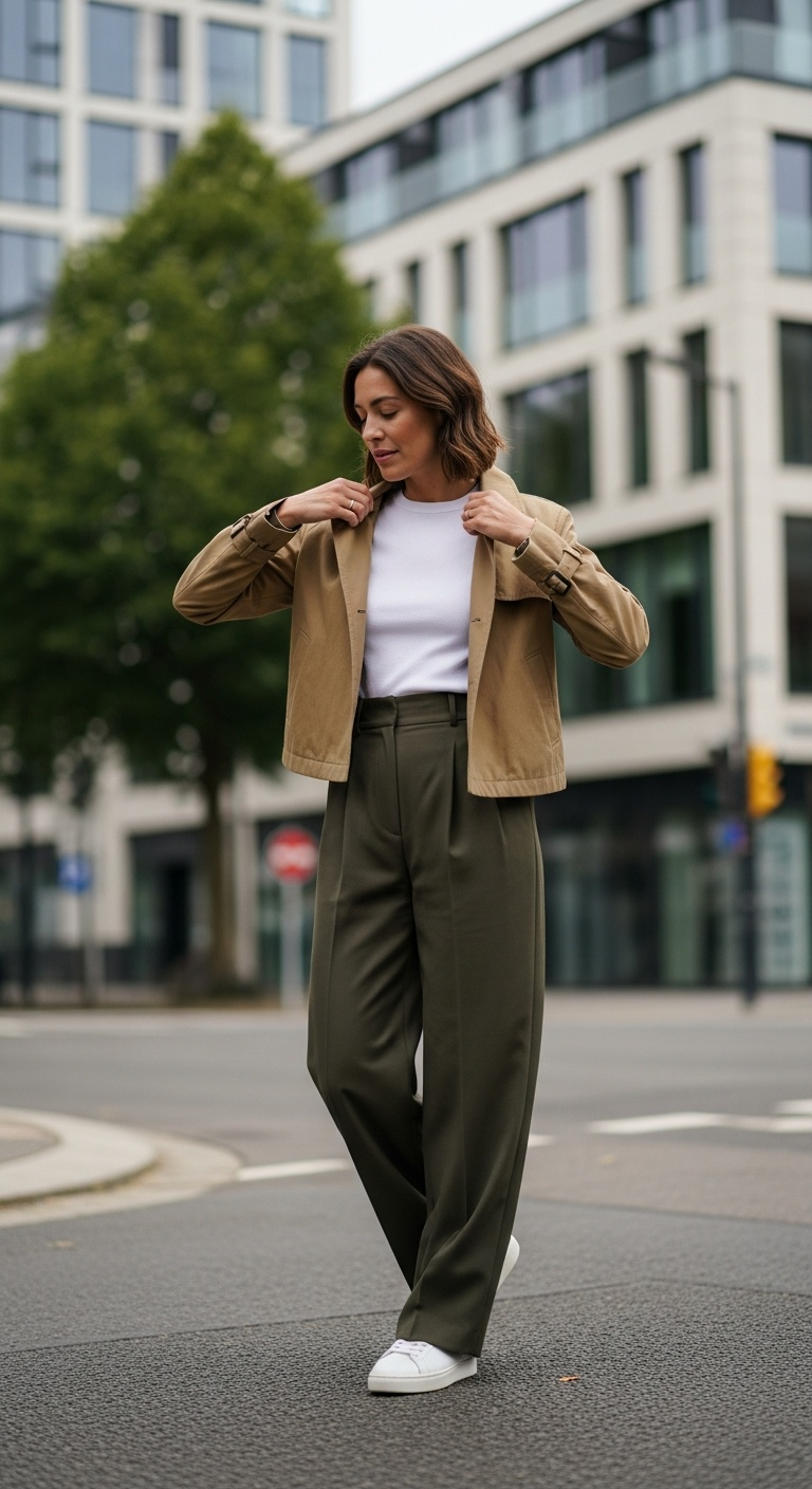 Alt text suggestion: May outfit ideas for women showing a cropped khaki trench over a white tee and dark olive wide-leg trousers with white sneakers on an urban street corner.