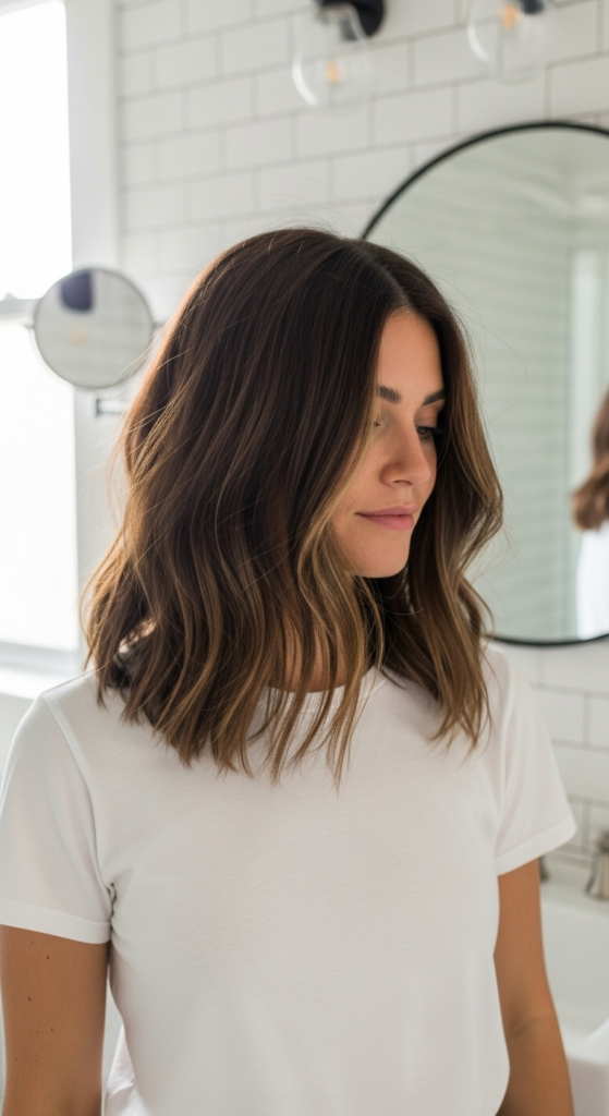 Alt text suggestion: Real life medium length hairstyles with a collarbone-length long bob and invisible layers, air-dried texture in bright bathroom.