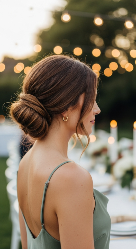 Alt text suggestion: Real life medium length hairstyles designed for updos: low messy bun with face-framing pieces at an outdoor garden party.