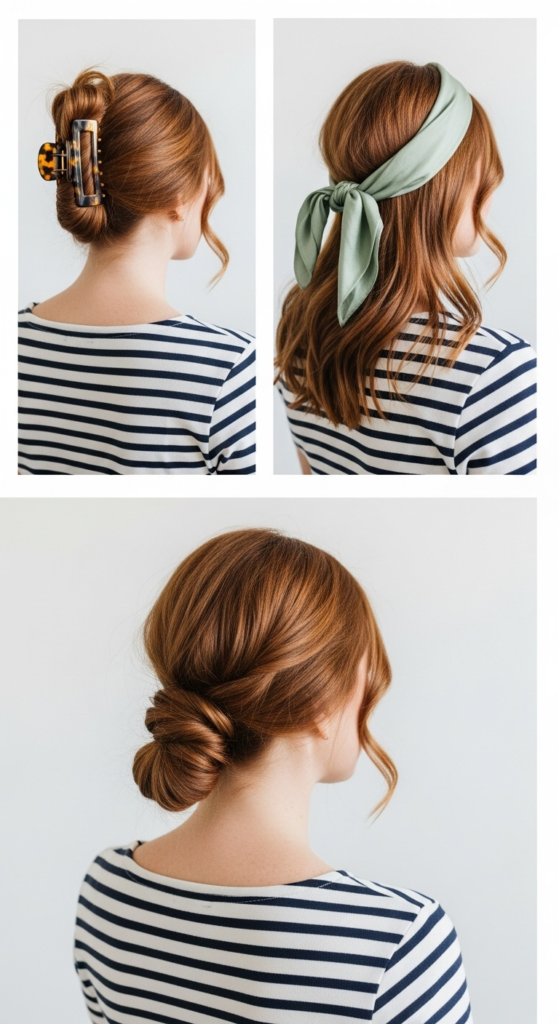 Alt text suggestion: Real life medium length hairstyles quick styling ideas: claw clip half-up, silk scarf headband, and low twisted ponytail (triptych).