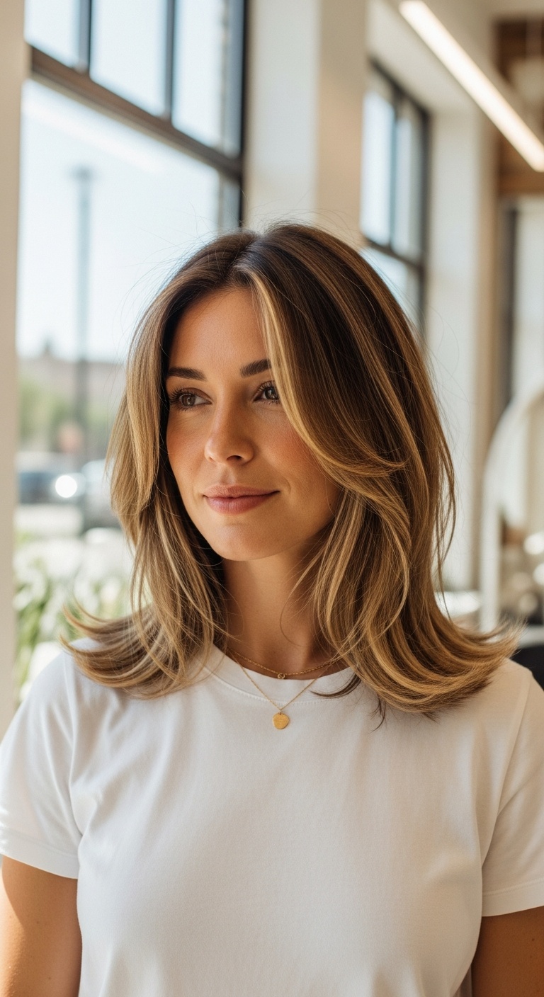 Alt text suggestion: Low-maintenance mid-length haircuts for spring 2026 shown as a soft shoulder-length layered cut in a bright modern salon.