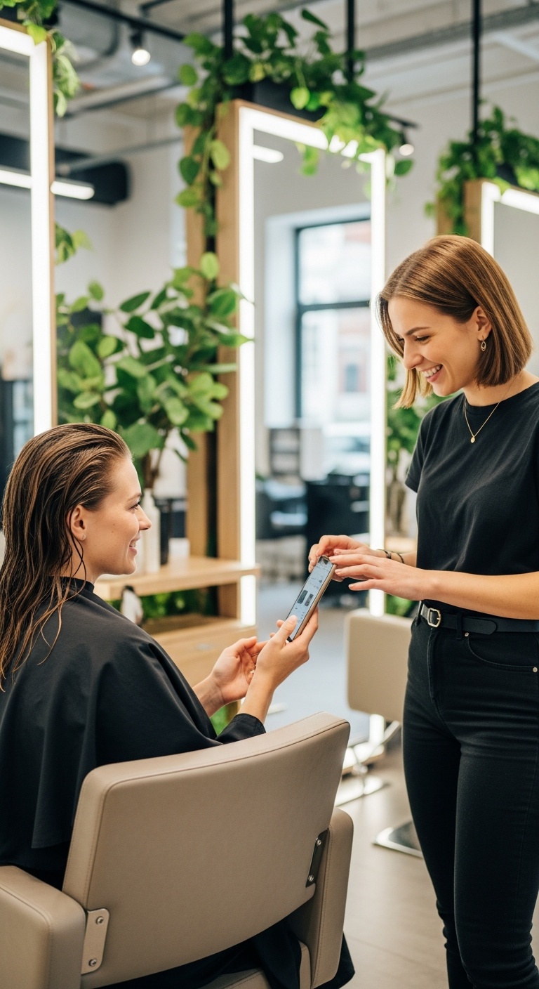 Alt text suggestion: Low-maintenance mid-length haircuts for spring 2026 consultation with a client showing hairstyle inspiration photos to her stylist.