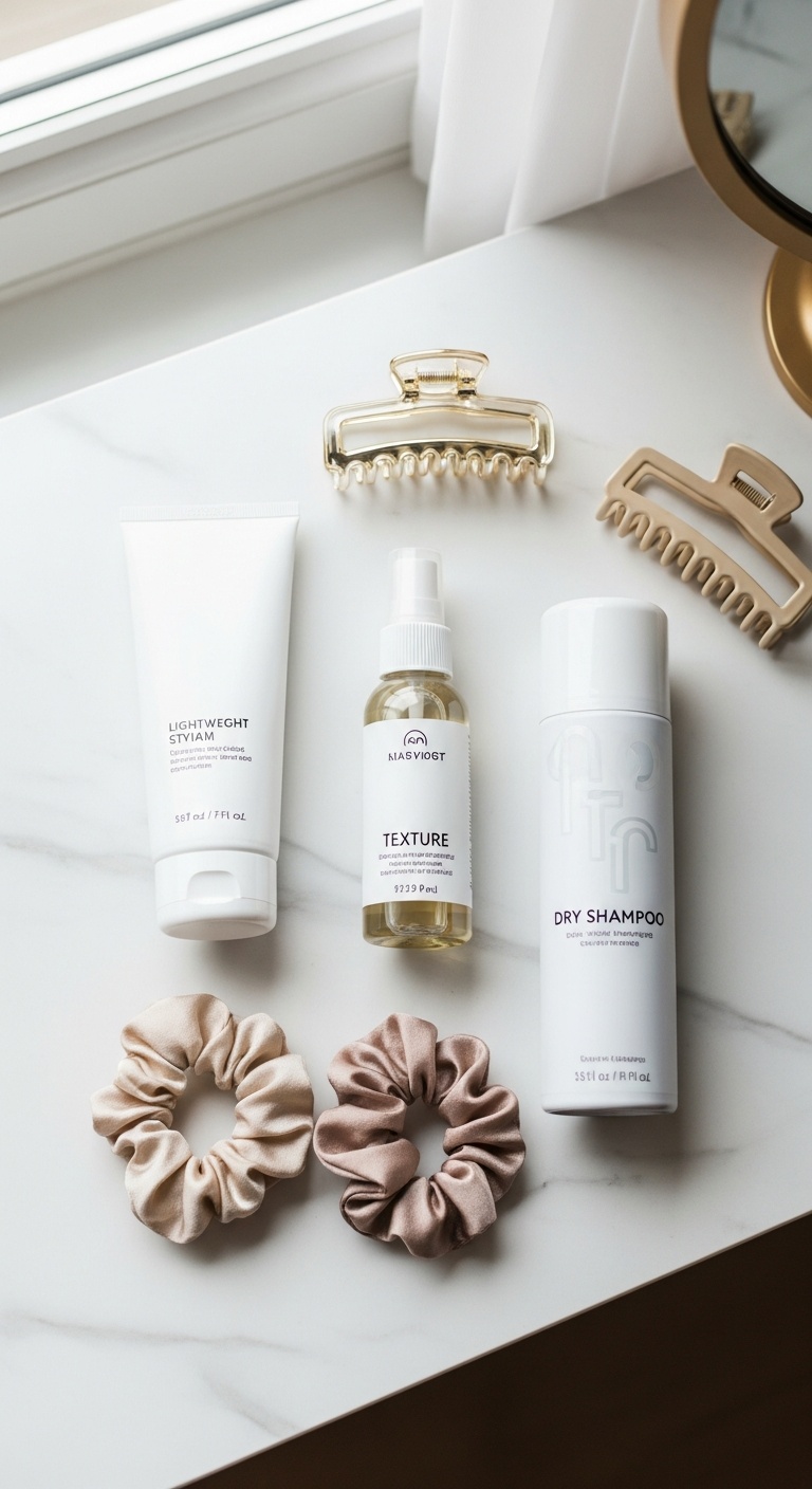Alt text suggestion: Low-maintenance mid-length haircuts for spring 2026 styling routine with lightweight cream, texture spray, dry shampoo, and claw clips.