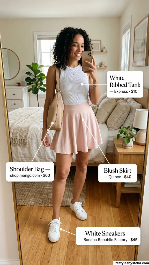 Shop This Look: The White Ribbed Tank is from Express at $10 — shop it here. The Blush Skirt by Quince for $40 — grab it here. The Shoulder Bag from Mango at $60 — find it here. And the White Sneakers from Banana Republic Factory at $45 — check them out here.