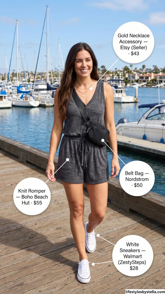 Shop This Look: The Knit Romper is from Boho Beach Hut at $55 — shop it here. The Belt Bag by Nordstrom for $50 — grab it here. The Gold Necklace Accessory from Etsy at $43 — find it here. And the White Sneakers from Walmart (ZestySteps) at $28 — check them out here.