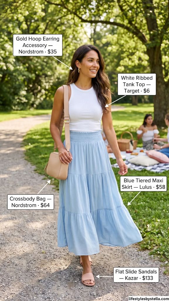 Flat slide sandals are the right call here — anything with a heel would fight against the relaxed bohemian energy of the skirt. If you’ve been exploring cute summer skirt outfits, this blue tiered maxi should be at the very top of your list. It’s a head-turner that feels like wearing a cloud.