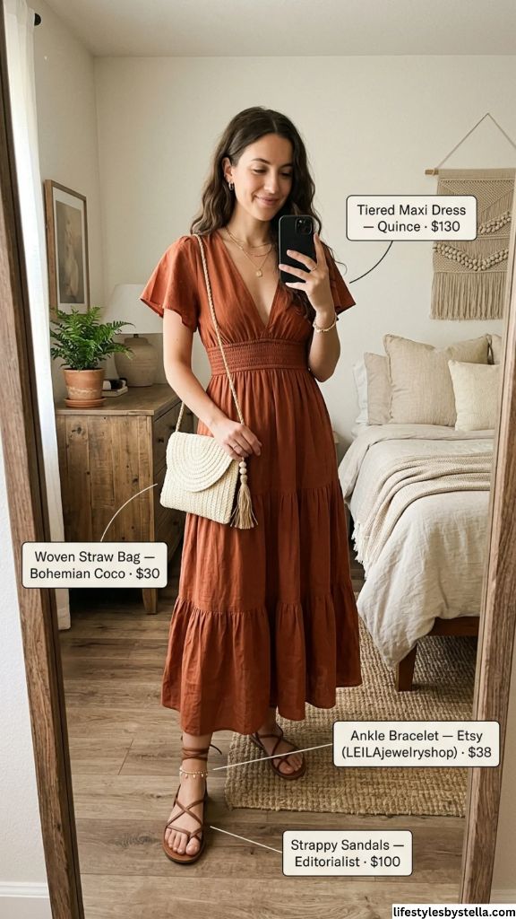 Shop This Look: The Tiered Maxi Dress is from Quince at $130 — shop it here. The Woven Straw Bag by Bohemian Coco for $30 — grab it here. The Ankle Bracelet from Etsy (LEILAjewelryshop) at $38 — find it here. And the Strappy Sandals from Editorialist at $100 — check them out here.