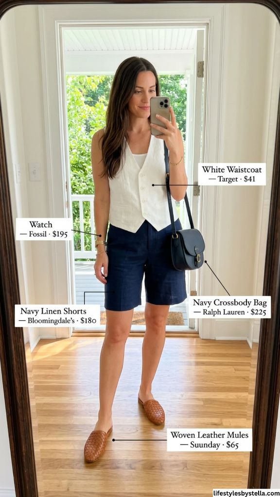 Shop This Look: The White Waistcoat is from Target at $41 — shop it here. The Navy Linen Shorts by Bloomingdale’s for $180 — grab them here. The Navy Crossbody Bag from Ralph Lauren at $225 — find it here. The Watch from Fossil at $195 — check it out here. And the Woven Leather Mules from Suunday at $65 — snag them here.