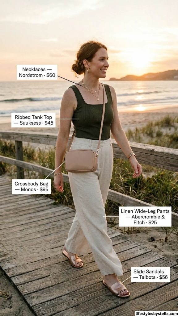 Shop This Look: The Ribbed Tank Top is from Suuksess at $45 — shop it here. The Linen Wide-Leg Pants by Abercrombie & Fitch for $25 — grab them here. The Crossbody Bag from Monos at $95 — find it here. The Necklaces from Nordstrom at $60 — check them out here. And the Slide Sandals from Talbots at $56 — snag them here.