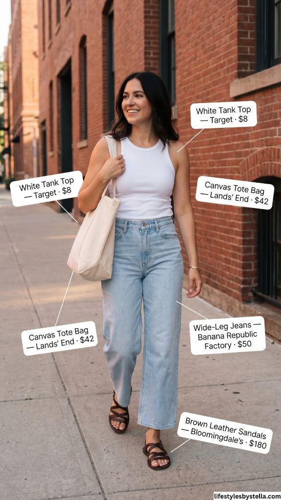 Shop This Look: The White Tank Top is from Target at $8 — shop it here. The Wide-Leg Jeans by Banana Republic Factory for $50 — grab them here. The Canvas Tote Bag from Lands’ End at $42 — find it here. And the Brown Leather Sandals from Bloomingdale’s at $180 — check them out here.