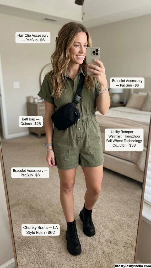 Shop This Look: The Utility Romper is from Walmart (Hangzhou Fall Wheat Technology Co., Ltd.) at $33 — shop it here. The Belt Bag by Quince for $26 — grab it here. The Chunky Boots from LA Style Rush at $62 — find them here. The Hair Clip Accessory from PacSun at $6 — snag it here. And the Bracelet Accessories from PacSun at $6 each — check them out here.