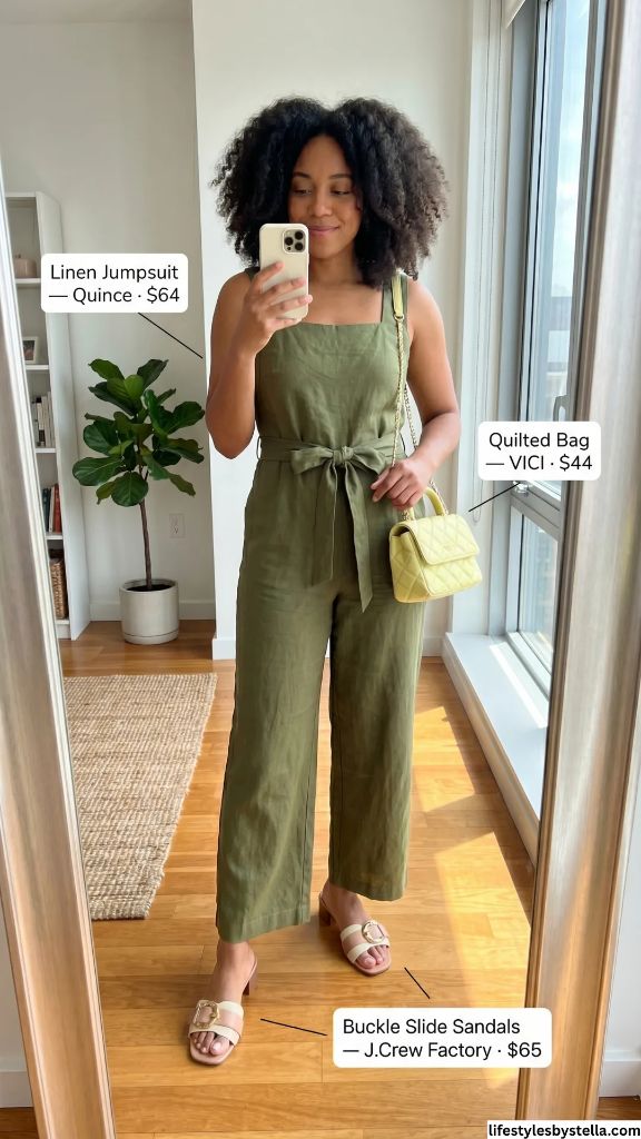 Shop This Look: The Linen Jumpsuit is from Quince at $64 — shop it here. The Quilted Bag by VICI for $44 — grab it here. And the Buckle Slide Sandals from J.Crew Factory at $65 — find them here.
