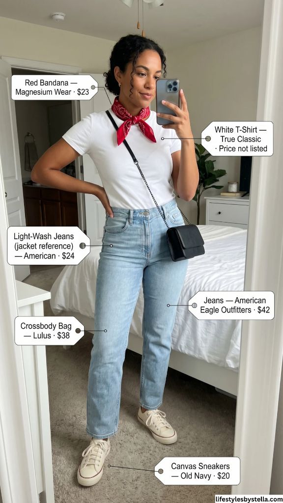 Shop This Look: The Red Bandana is from Magnesium Wear at $23 — shop it here. The White T-Shirt by True Classic — grab it here. The Jeans from American Eagle Outfitters at $42 — find them here. The Crossbody Bag from Lulus at $38 — check it out here. And the Canvas Sneakers from Old Navy at $20 — snag them here.