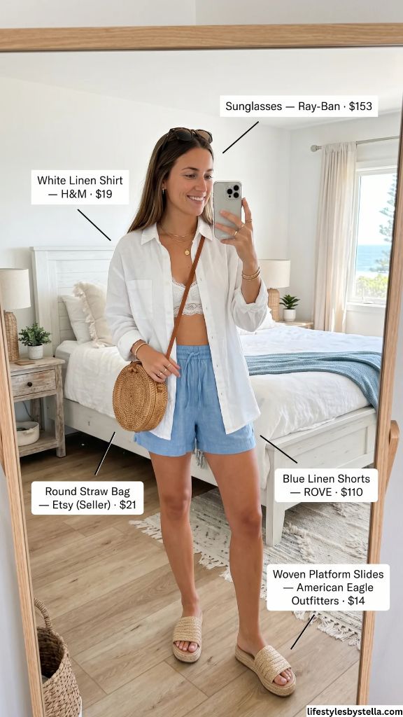 Shop This Look: The White Linen Shirt is from H&M at $19 — shop it here. The Blue Linen Shorts by ROVE for $110 — grab them here. The Sunglasses from Ray-Ban at $153 — find them here. The Round Straw Bag from Etsy at $21 — check it out here. And the Woven Platform Slides from American Eagle Outfitters at $14 — snag them here.