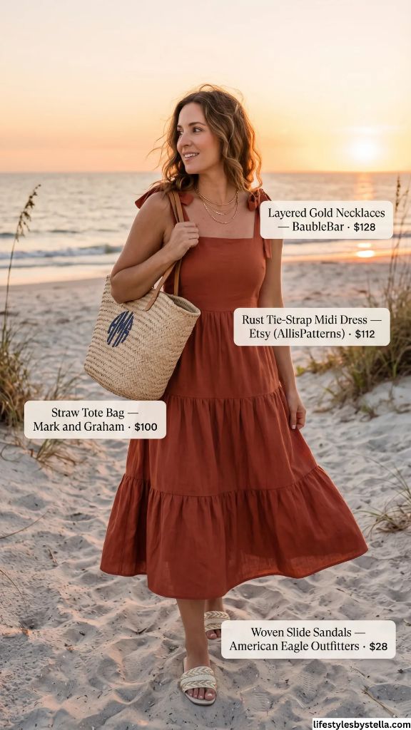 Shop This Look: The Rust Tie-Strap Midi Dress is from Etsy (AllisPatterns) at $112 — shop it here. The Layered Gold Necklaces by BaubleBar for $128 — grab them here. The Straw Tote Bag from Mark and Graham at $100 — find it here. And the Woven Slide Sandals from American Eagle Outfitters at $28 — check them out here.