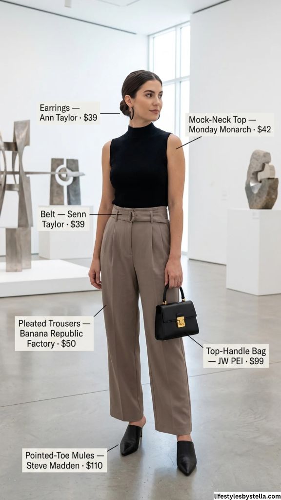 Shop This Look: The Mock-Neck Top is from Monday Monarch at $42 — shop it here. The Pleated Trousers by Banana Republic Factory for $50 — grab them here. The Belt from Senn Taylor at $39 — find it here. The Earrings from Ann Taylor at $39 — shop them here. The Top-Handle Bag by JW PEI for $99 — snag it here. And the Pointed-Toe Mules from Steve Madden at $110 — check them out here.